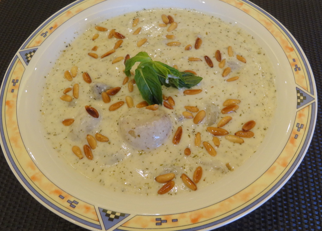 - Pour into deep plates and decorate with pine nuts. Enjoy it warm or cold. You could have it with cooked rice if you’d like.